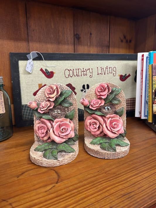 Vintage Pink Ceramic Roses & Birds Nest Bookends